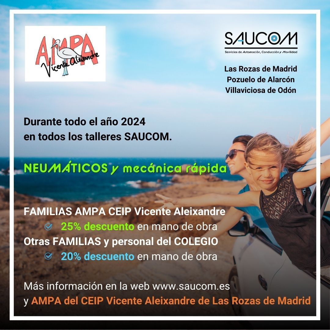 Por eso, en los lugares donde tenemos nuestros centros talleres SAUCOM tratamos de colaborar con AMPAS y centros educativos para que sea más afrontable para las familias tener siempre los neumáticos en buen estado o realizar los mantenimientos de los vehículos (aceites, filtros, revisiones, baterías, pinchazos...).